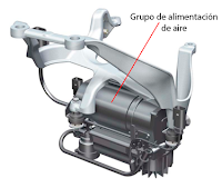 El grupo de alimentación de aire incorpora una unidad de mando, un compresor con filtro deshidratador y válvulas de descarga, un relé para el compresor, y unas válvulas de suspensión.